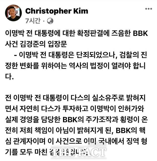 김씨는 31일 자신의 페이스북에 '이명박 전 대통령에 대한 확정판결에 즈음한 BBK 사건 김경준의 입장문'이라는 제목의 글을 올려 이같이 밝혔다.