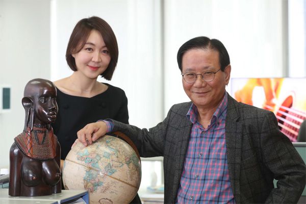 서울 강남 작업실에서 만난 만화가 이원복 교수(오른쪽)와 `먼나라 이웃나라`를 뮤지컬로 제작한 이강 이강플레이 대표가 지구본을 가운데 두고 활짝 웃고있다. [이충우 기자] |