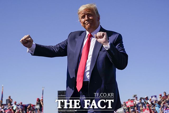미국 대통령 선거의 첫개표지인 뉴햄프셔주 북부 산골 마을 2곳의 자정투표에서 공화당 도널드 트럼프 대통령이 3일(현지시간) 첫 승리를 거뒀다. 트럼프 대통령이 선거 유세 연설을 한 뒤 춤추고 있다. /AP.뉴시스