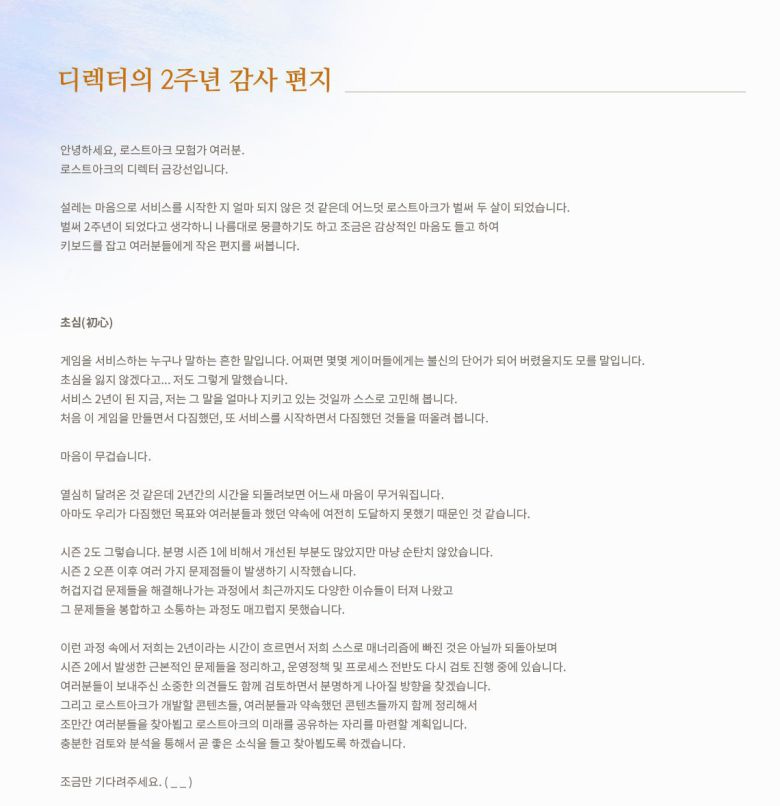최근 로스트아크의 금강선 디렉터는 공식 홈페이지를 통해 ‘디렉터의 2주년 감사 편지’를 게시하고 이용자들에게 감사의 마음을 전하기도 했다. 그는 감사 편지를 통해 2년간의 서비스를 돌아보며 느낀 소회와 함께 팬들에게 미안함과 고마움을 표현했다.