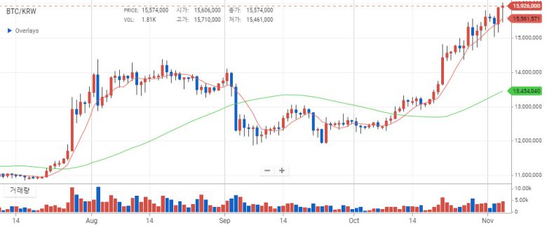 비트코인은 전일 고점 기준으로 1,600만원을 돌파하며 2019년 7월 이후 최고점을 갱신했습니다.