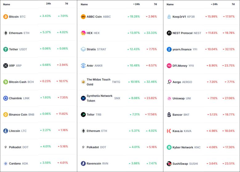 전일 거래대금이 1,000만 달러 이상이었던 코인 중에서는 ABBC코인(ABBC)이 +19%로 가장 높은 상승률을 기록했으며, 그 뒤를 이어 헥스(HEX), 스트라티스(STRAT), 앵커(ANKR), 더마이더스터치골드(TMTG), 신세틱스네트워크(SNX), 텔러(TRB), 이더리움(ETH), 폴카닷(DOT), 레이븐코인(RVN)이 3~13%대 상승률을 나타냈습니다.