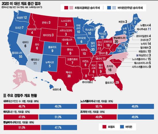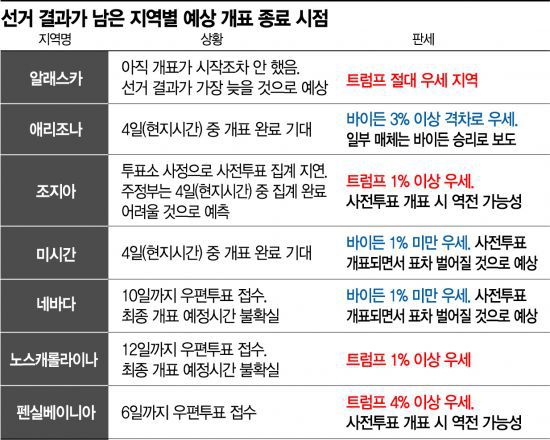 지역별로 살펴보면 이번 대선에서 최대 이변으로 꼽히는 애리조나의 경우 가장 먼저 선거 결과가 확인될 것으로 보인다. 현재 바이든 후보가 3% 이상 격차를 보이며 우세를 보이고 있다. 뉴욕타임스(NYT)는 애리조나의 개표는 이날 중 끝날 것으로 봤다. 이미 일부 미국 언론들의 경우 바이든 후보가 승리했다고 판정하는 상황이다.