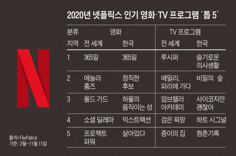 ‘플릭스패트롤’을 통해 올해(2월~이달 11일까지) 순위를 분석해봤다. 우선 영화. 전 세계에서 가장 많이 본 영화는 ’365일', 2~5위는 에놀라 홈즈, 올드 가드, 소셜 딜레마, 프로젝트 파워였다. 한국에서도 1위는 365일. 2~5위는 정직한 후보, 하울의 움직이는 성, 익스트랙션, 살아있다 순이었다. 전 세계와 한국에서 동시에 10위 안에 든 영화는 365일 외에 에놀라 홈즈(전세계 2위·한국 6위), 익스트랙션(7위·4위), 키싱 부스 2(6위·10위)가 있었다.
