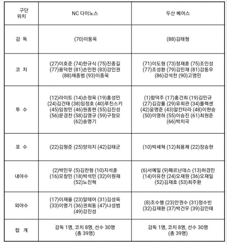 [스포티비뉴스=박성윤 기자] 2020년 한국시리즈에 나설 두산 베어스와 NC 다이노스 선수 명단이 16일 발표됐다.