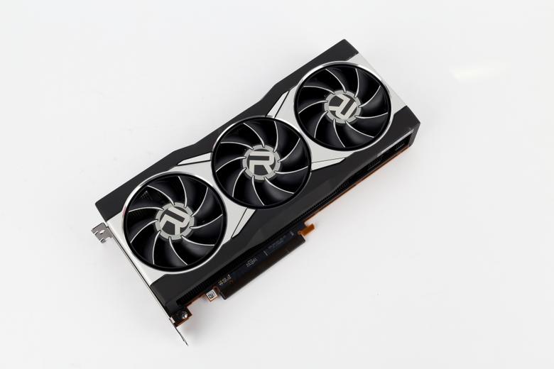 상단 디자인 역시 RX 6800과 비슷하다. 전원을 켜면 RADEON 조명이 붉게 빛나는 것 역시 동일하다. 다만 RX 6800보다 성능이 뛰어난 만큼 방열판의 무게가 더 두껍다. 슬롯 사이즈가 RX 6800보다 두꺼운 것도 이와 연관이 깊다. 전원포트는 8핀 2개를 사용하며, 소비전력은 300W다.