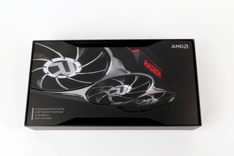 박스 내부에는 커버가 위치해 있다. 16GB 그래픽 메모리와 PCIe 4.0을 지원함을 확인할 수 있다. AMD 피델리티FX도 이용 가능함을 알 수 있다. 이것은 개발자를 위해 마련된 오픈소스 툴킷으로, 라이팅, 그림자 및 반사 효과 기능을 갖추고 있어 개발자가 더 실감나는 그래픽의 게임을 만들 수 있도록 도와준다.