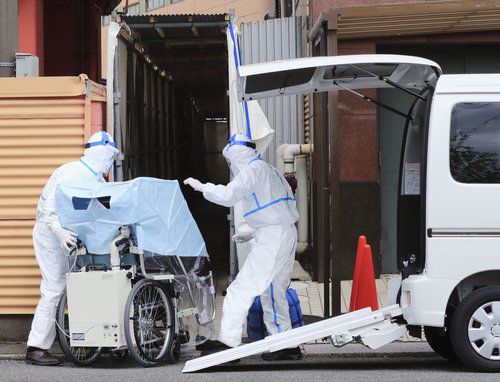 (기후 교도=연합뉴스) 지난 21일 일본 기후현 하시마시에서 보건 당국자들이 신종 코로나바이러스 감염증(코로나19) 환자를 호텔로 이송하고 있다. 일본은 병상 부족 문제를 해소하기 위해 경증 환자는 호텔 등에, 중증 환자는 의료기관에 수용하는 방안을 추진하고 있다. 2020.4.22 photo@yna.co.kr