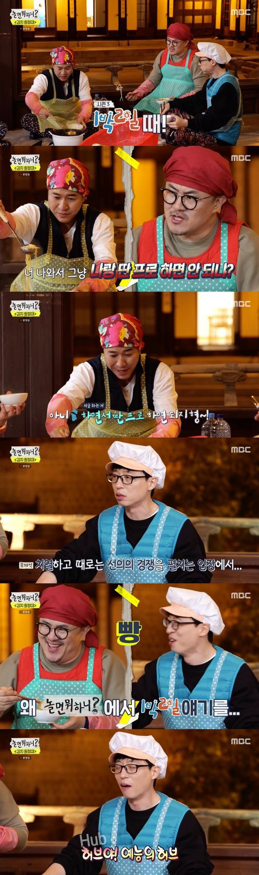 두 사람의 대화를 듣던 유재석은 "같은 연예계에 치열하고 때로는 선의의 경쟁을 펼치는 입장에서 왜 우리 프로에서 '1박 2일' 얘기를 하냐"고 해 웃음을 자아냈다. 이에 정재형은 "'놀면 뭐하니?'가 예능의 허브다. 여기서 뻗어나가는 거다"라고 수습했다.