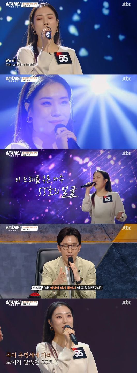 다이나믹한 OST조의 격변이 일어나고 있는 가운데, 55호가 가수가 등장했다. 그녀는 바로 드라마 'SKY 캐슬' OST 'We all Lie'를 부른 가수 하진이었다. 모두를 소름돋게 만든 가운데, 최종 7개 어게인을 받고 다음 라운드까지 진출했다.