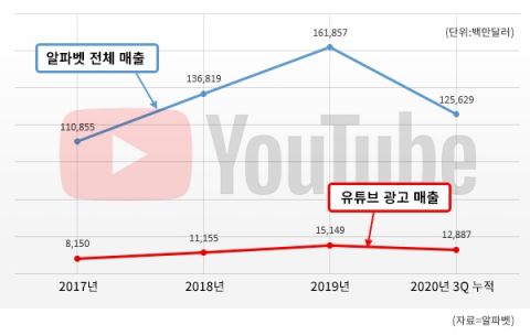 2분기 신종 코로나바이러스 감염증(코로나19) 여파로 알파벳이 역대 첫 매출 감소를 기록했을 때도 유튜브 광고 매출은 6% 성장했다. 구글 검색·광고 매출이 10% 줄어든 것과 비교하면 엄청난 성장세다. 3분기엔 유튜브 광고 매출이 32% 성장하며 알파벳도 깜짝 실적을 냈다.