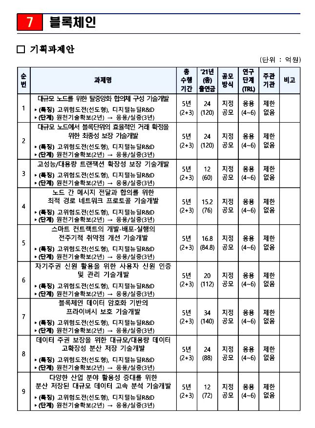 사업 내용을 들여다 보면 의구심은 더욱 깊어진다. 산학연 블록체인 전문가 그룹 110여 명이 한차례 탈락의 고배를 마시며 2년여의 준비 끝에 완전 탈중앙화 고성능 합의기술 사용자 중심 스마트 컨트렉트 기술 개인정보처리 및 신원관리를 위한 블록체인 기술 데이터 주권형 Trust-DB Chain 기술 등 4개 과제를 확정해 지난 6월 말 KISTEP(한국과학기술평가원)에 공개됐다.
