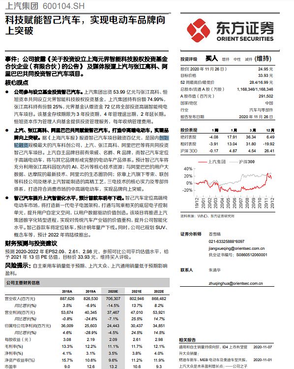 이와 관련, 중국 둥팡증권은 27일 보고서에서 2020~2022년 상하이자동차 예상 매출을 각각 7063억, 8029억, 8684억 위안으로, 직전년도 대비 각각 -14.5%, 13.7%, 8.2% 증가할 것으로 전망했다. 같은기간 영업이익은 374억, 470억, 539억 위안으로, 직전년도 대비 증가율은 각각 -7.1%, 25.5%, 14.7%에 달할 것으로 예상했다. 이 기간 주당순이익(EPS)은 각각 2.09/2.61/2.98위안으로 내다봤다. 목표주가는 33.93위안으로, 투자의견은 '매입'을 유지했다.