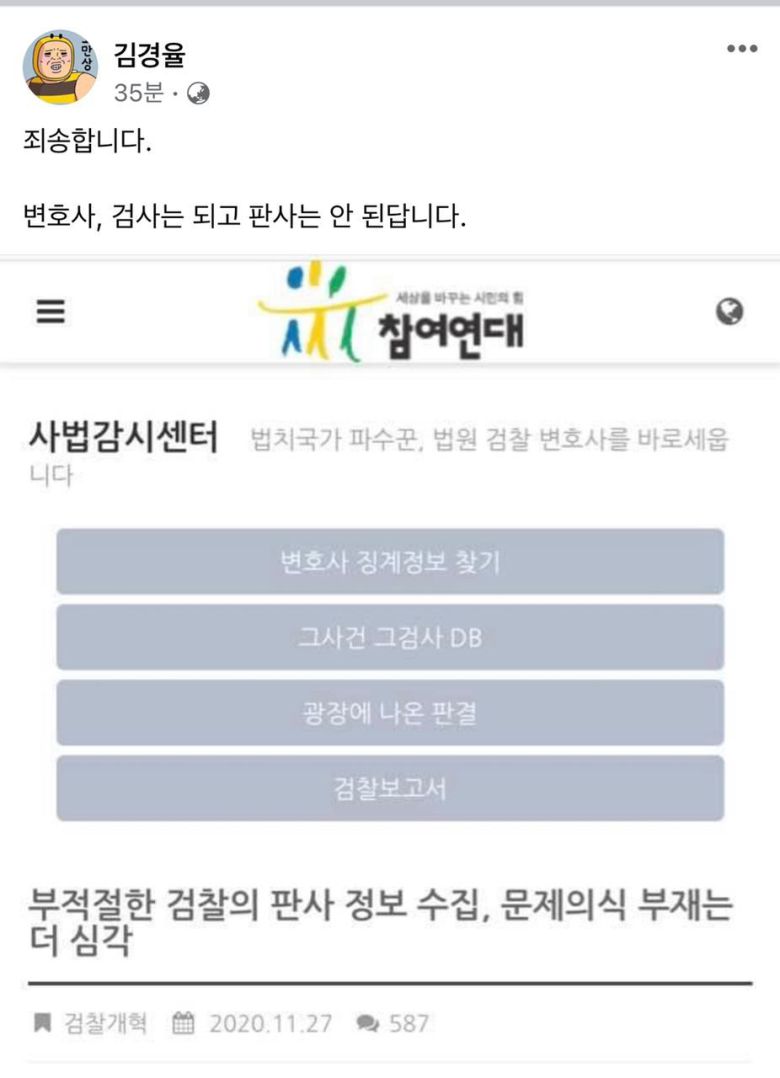 김경율 경제민주주의21 대표(회계사)는 28일 본인의 페이스북에 참여연대 사법감시센터 사이트 모바일 화면을 띄우며 “죄송합니다. 변호사, 검사는 되고 판사는 안 된답니다”라는 글을 올렸다. 이 화면에는 ‘변호사 징계정보 찾기', ‘그 사건 그 검사 DB’ 등의 항목이 나열돼 있는데, 화면 아래쪽을 보면 참여연대에서 27일 낸 ‘부적절한 검사의 판사 정보 수집, 문제의식 부재는 더 심각'이라는 성명이 게시돼 있다.