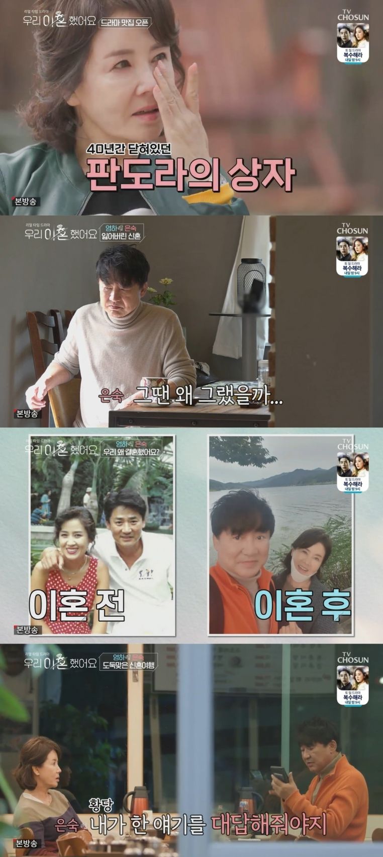 '우리 이혼했어요' 선우은숙과 이영하가 과거 이야기를 나누며 쌓아놓은 마음을 전했다. [사진=TV CHOSUN 방송화면 캡처] |