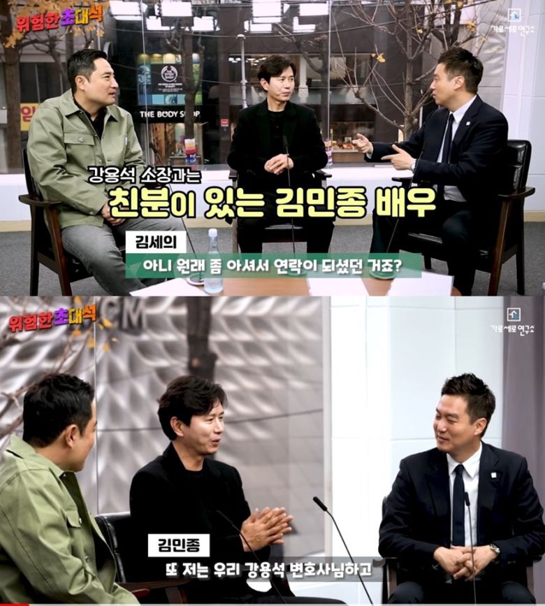 이날 "위험한 초대석이라고 해서 왠지 불안해졌다"고 운을 뗀 김민종은 "우리 강용석 변호사님하고 굉장히 친분이 좀 예전에 있었다"고 밝혔다. 강용석과의 인연으로 '가세연'에 출연한 것.
