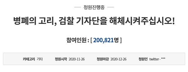 '병폐의 고리, 검찰 기자단을 해체시켜 주십시오!'라는 제목의 청원은 30일 오전 7시 기준 20만여 명의 동의를 얻었다. 게시 이후 30일 동안 20만 이상 추천 청원에 대해서는 정부 및 청와대 책임자가 답하고 있다.
