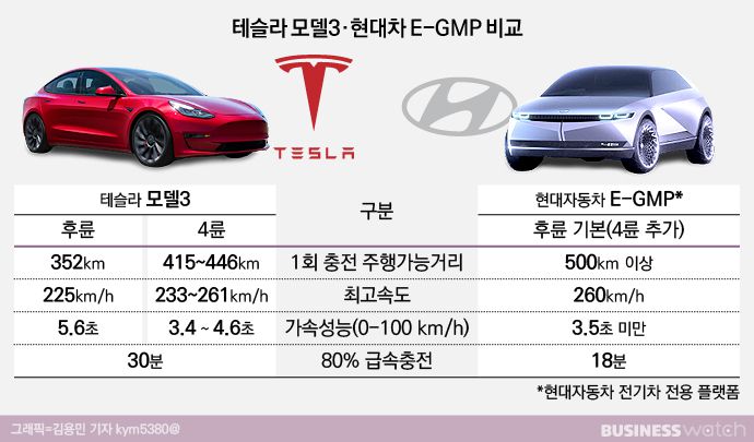 이 같은 성능은 테슬라와 비교해도 뒤처지지 않는다. 테슬라의 모델3 사륜 구동 모델의 최고 속도는 261km/h, 제로백은 3.4~4.6초다. 완충 후 주행가능거리는 테슬라(415~446km)보다 E-GMP(500km)가 앞선다. 특히 충전속도에선 현대차가 한 수 위다. E-GMP가 급속충전기로 80% 충전할 때 걸리는 시간은 18분으로, 테슬라(30분)보다 빠르다는 게 현대차그룹 설명이다.