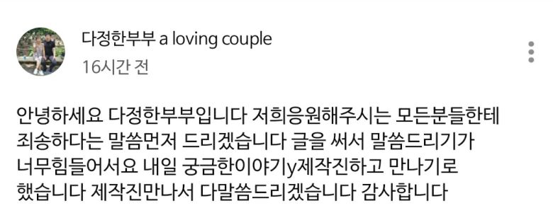 2일 오후 다정한 부부는 유튜브 커뮤니티에 "저희를 응원해 주시는 모든 분들에게 죄송하다는 말씀 먼저 드린다. 글로 말씀드리기 힘들다. 내일 SBS '궁금한 이야기Y' 제작진과 만나기로 했다. 만나서 다 말씀드리겠다"고 적었다.