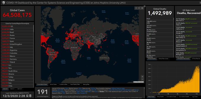 미국 존스홉킨스대학의 시스템사이언스·엔지니어링센터(CSSE) 코로나19 상황판에 따르면 한국시간 3일 오후 2시28분 기준 전 세계 누적 확진자 수는 하루 전보다 66만9152명 증가한 6450만8175명을 기록했다. 코로나19 총사망자 수는 1만2988명 늘어난 149만2989명으로 집계됐다.