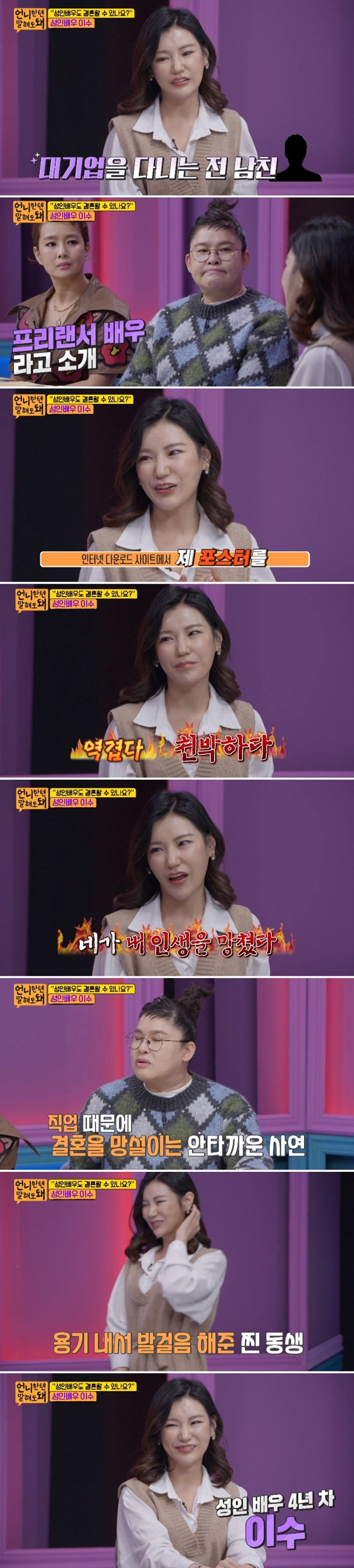 성인배우 이수가 직업 때문에 생긴 고민과 함께 전 남자친구의 폭언으로 생긴 트라우마를 고백했다.