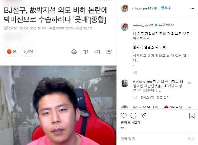 박미선은 4일 오전 인스타그램을 통해 철구가 생방송 도중 개그우먼 고(故) 박지선의 외모를 비하하는 발언을 해 뭇매를 맞았다는 기사 화면을 캡처하며 “누구세요?”라고 적었다.