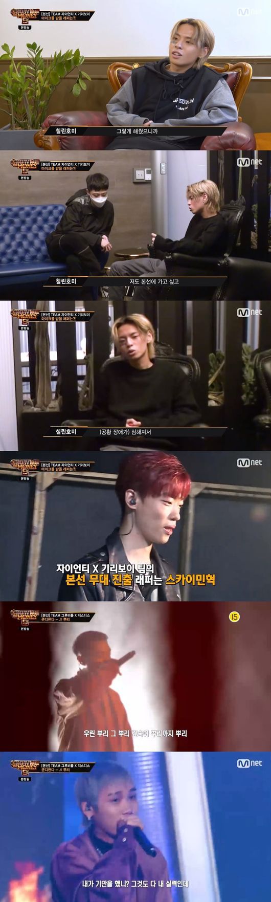 4일에 방송된 Mnet '쇼미더머니9'에서는 그루비룸X저스티스 팀이 승리한 가운데 자이언티X기리보이팀에서 스카이민혁이 탈락했다. 칠린호미는 공황장애 악화로 인해 본선 무대를 포기했다.