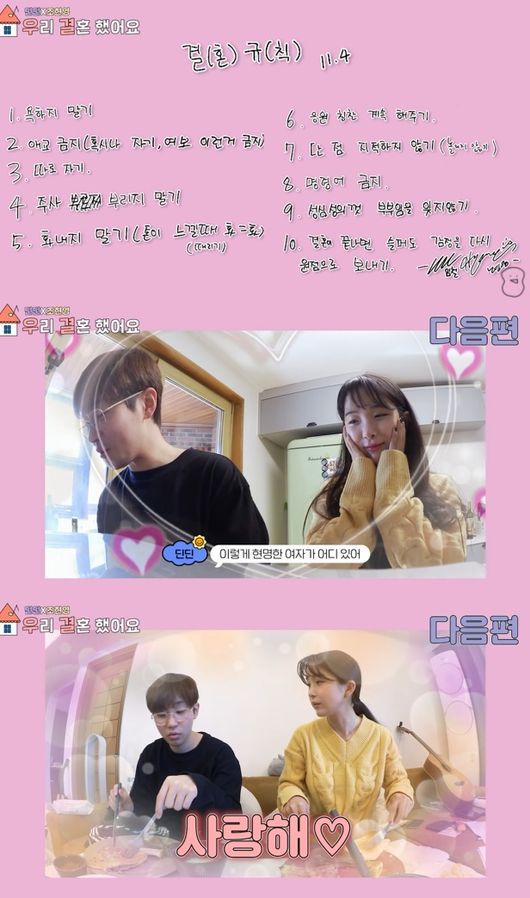 ‘우리 결혼했어요’에 앞서 딘딘과 조현영은 금지 사항을 적은 서약서를 작성했다. ‘욕하지 않기’, ‘애칭 및 애교 금지’, ‘잘 때 따로 자기’, ‘주사 부리지 않기’, ‘화내지 않기’, ‘단점 지적하지 않기’, ‘명령어 금지’, ‘부부임을 잊지 않기’, ‘결혼이 끝나서 슬퍼도 감정을 원점으로 돌리기’ 등 10가지 규칙이 만들어졌다.