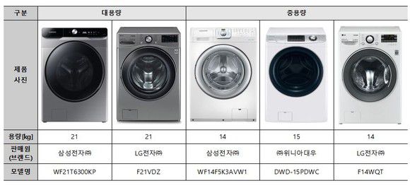 조사 대상은 삼성전자 'WF21T6300KP'(대용량)와 'WF14F5K3AVW1'(중용량), 위니아전자 'DWD-15PDWC'(중용량), LG전자 'F21VDZ'(대용량), 'F14WQT'(중용량)이다. 4월 온라인 구매가 기준 대용량 제품은 140만원대였고 중용량은 59만~66만원선의 제품들이다.