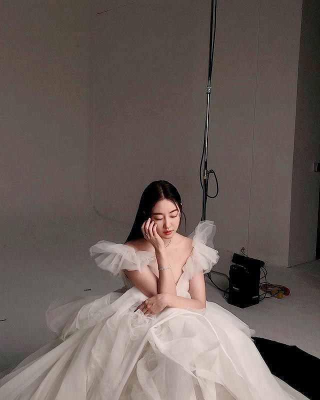 공개된 영상과 사진 속 김사랑은 '브이'(V)자로 깊게 파인 네크라인과 날개를 연상케 하는 러플 장식, 가벼운 소재가 돋보이는 화이트 드레스를 입고 촬영에 임하는 모습이다.