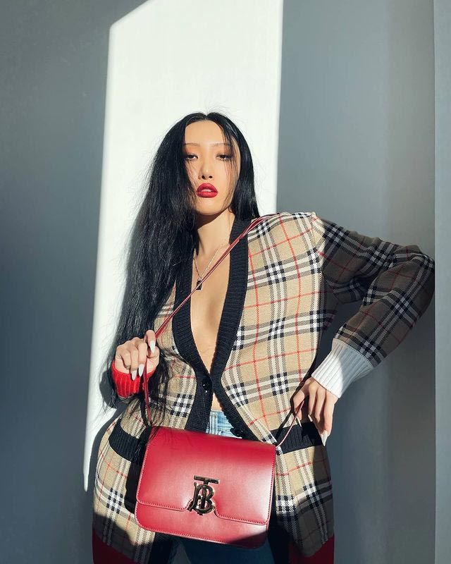 공개된 사진 속 화사는 클래식한 체크 패턴과 블랙 라이닝이 돋보이는 브이넥 카디건에 밝은 색 청바지를 입고 다양한 포즈를 선보였다.