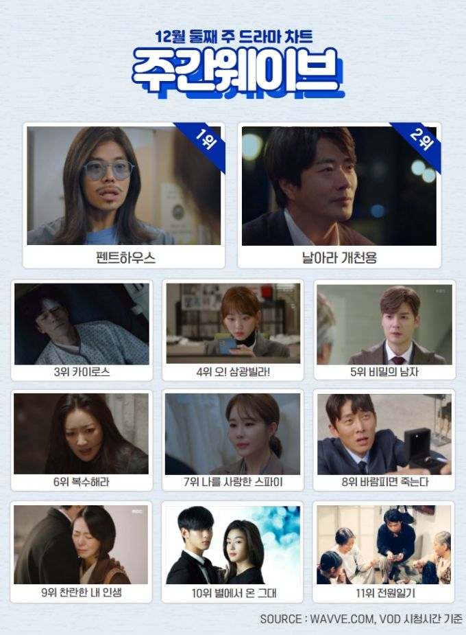 8일 웨이브에 따르면, 12월 둘째 주 주간웨이브(wavve) 국내드라마 차트에서 '펜트하우스'는 올 하반기 역대 최고 시청시간으로 1위를 차지했다.