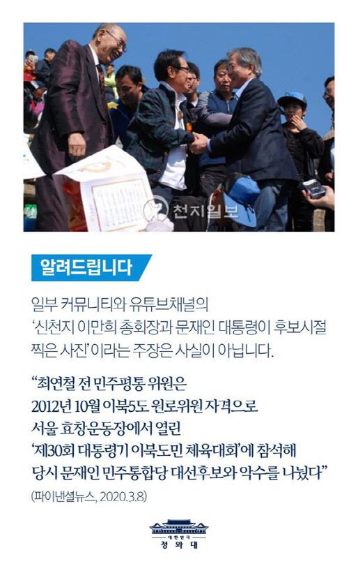앞서 청와대는 올해 3월 이만희 신천지 총회장과 사진을 찍었다는 의혹에 대해 “사실이 아니다”라고 밝혔다.