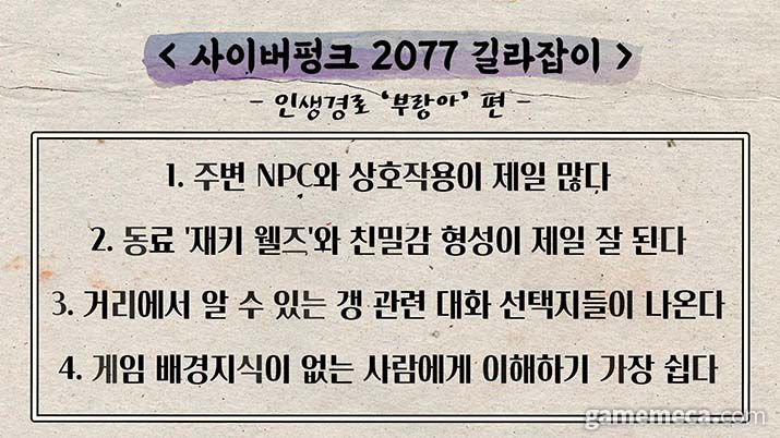 게임메카는 사이버펑크 2077의 방대한 오픈월드에 뛰어드는 유저분들을 위해 인생경로 길라잡이가 되어드리고자 합니다. 광활한 황무지를 내달리는 액션이 인상적인 노마드, 주변 NPC와 친밀감 형성을 제대로 느낄 수 있는 부랑아 그리고 거대 기업의 일원으로 전문적인 대화가 가능한 기업까지, 각 인생경로별 특징과 초반 플레이를 영상으로 공개합니다.