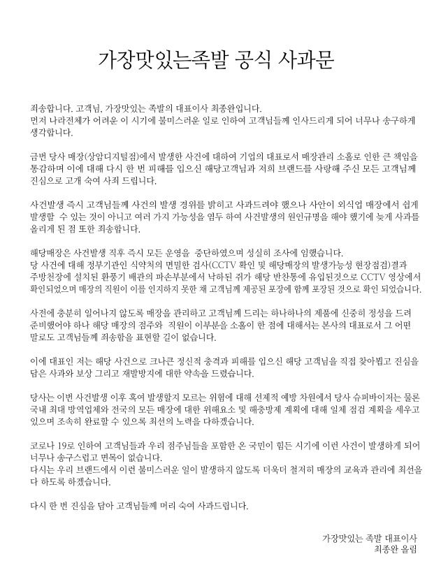 가장맛있는족발은 이날 홈페이지에 최종완 대표이사 명의의 공식 사과문을 띄웠다.