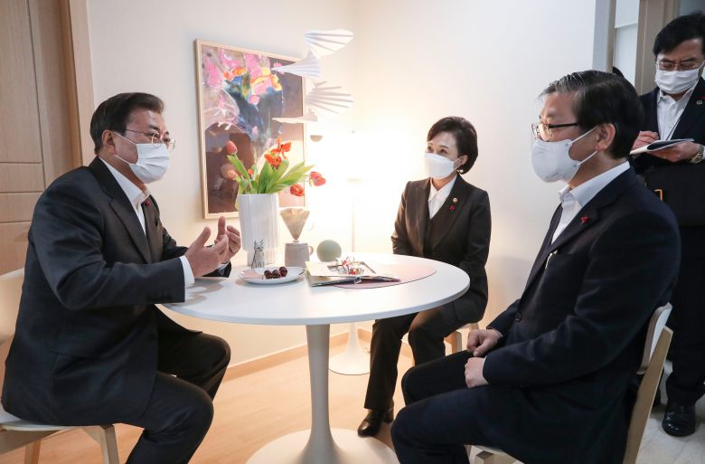 이에 문 대통령은 “주거도 발전해가지고 아이도 생기고 아이도 자라기도 하고 가족이 많아진다”라며 “굳이 자기가 자기 집을 소유하지 않더라도 임대주택으로도 충분히 좋은 주택으로도 발전할 수 있는 주거 사다리를 잘 만들어야 한다”고 했다.