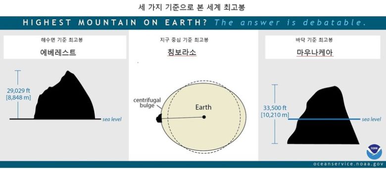 우선 지구는 완전히 둥근 천체가 아니다. 적도 부근이 좀더 두껍다. 지구 자전이 만드는 원심력 때문이다. 남북극을 잇는 반지름은 6357km, 적도 반지름은 6378km이다. 따라서 지구 중심에서부터 따지면 적도에 있는 산들이 훨씬 높이 솟아 있다.