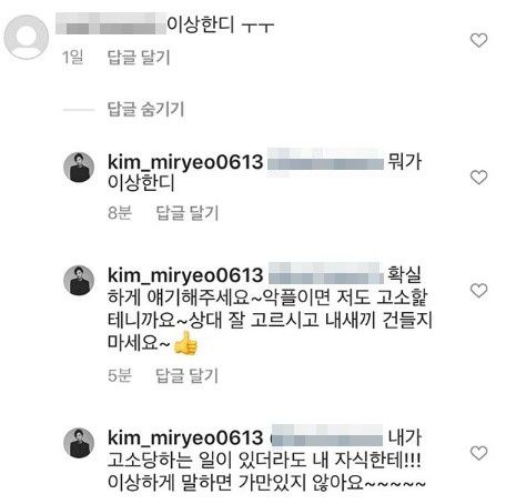김미려는 당시 자신의 인스타그램에 "그만 좀 하십시다...이건 그나마 유~~~해서 제가 공개합니다. 과거에 악플 남기셨던 분들 다행인 줄 아세요. 캡처는 다 해놨지만요 홍홍...사진이라도 있으면 같이 악플 남기죠~ 그쪽은 뭐가 이상한지.. 이게 직업이신가요? 내 새꾸한테 악플 남기시는 분들 답글 달아주길 원하시는 거에요? 어떻게 관심을 가져줄까요?"라는 글을 올렸다.