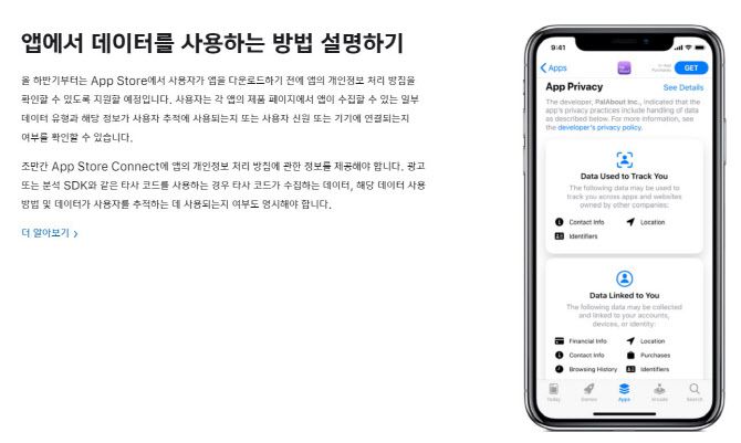 앞서 애플은 지난 6월 열린 세계개발자콘퍼런스(WWDC)에서 개발자의 프라이버시 관행을 앱 설명란에 표기하도록 하겠다고 발표한 바 있다. 이어 지난 8일부터 새로운 앱을 출시 하거나 기존 앱을 업데이트하는 개발자는 앱스토어에 개인정보 관련 자료를 제출하고 있다.