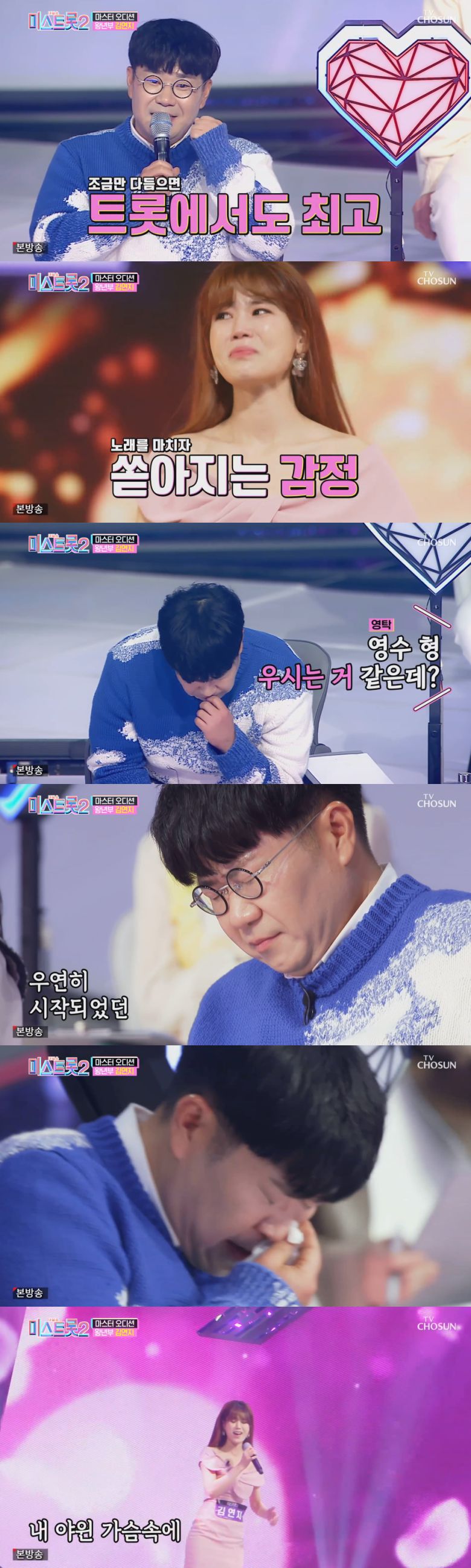 [스포츠서울 이게은기자] '미스트롯2' 작곡가 조영수가 그룹 씨야 김연지를 마주하고 폭풍 눈물을 흘렸다.