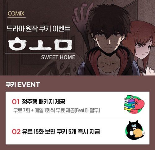 네이버 시리즈 앱 ‘스위트홈 드라마 오픈 기념 이벤트’는 이날부터 오는 24일까지 일주일간 진행한다. 네이버 시리즈 회원이라면 누구나 매일 밤 10시 웹툰 ‘스위트홈’ 무료 대여권 1매를 받을 수 있는 ‘매열무’ 이벤트와 함께, ‘스위트홈’ 유료 회차 15회분을 감상하면 쿠키 5개를 즉시 지급하는 쿠키지급 이벤트도 동시에 진행한다.