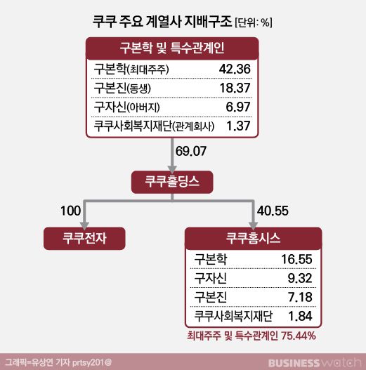 지주사 전환과 함께 구본학 대표 중심의 지배구조도 안정적으로 갖췄다. 구 대표는 1978년 쿠쿠전자의 전신인 성광전자를 창립한 창업주다. 구자경 LG그룹 명예회장과 10촌 뻘인 구자신 회장의 장남이기도 하다. 구 대표는 쿠쿠홀딩스 지분 42.36%(특수관계인 포함 69.07%)를 보유한 최대주주다. 구 대표는 쿠쿠홈시스 지분 16.55%도 직접 갖고 있다.