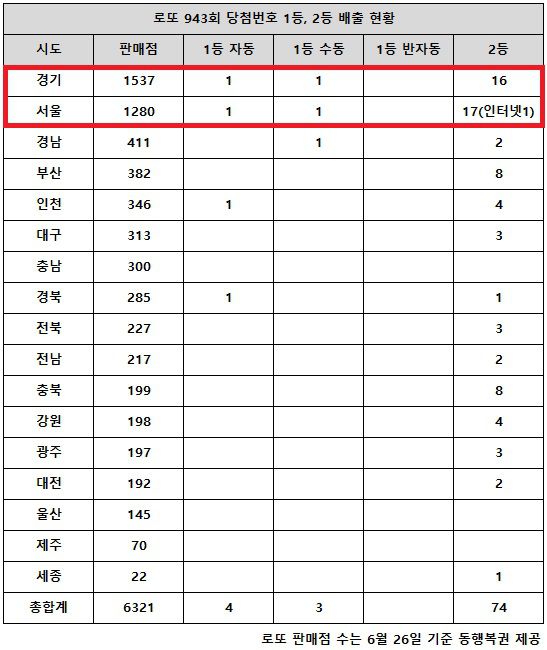 로또 943회 당첨번호 1등 배출 지역은 로또 판매점이 1537곳인 경기 판매점 중 2곳(자동·수동 각 1곳), 서울 1280곳 중 2곳(자동·수동 각 1곳), 경남 411곳 중 1곳(수동), 인천 346곳 중 1곳(자동), 경북 285곳 중 1곳(자동)이다.