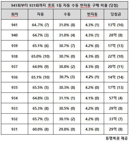 앞서 지난 10월 3일 추첨한 931회차에서도 서울과 경기는 로또 1등과 2등 당첨번호 배출점이 같았다. 당시 1등은 각 자동 2곳, 2등은 각 11곳으로 동률을 이뤘다.