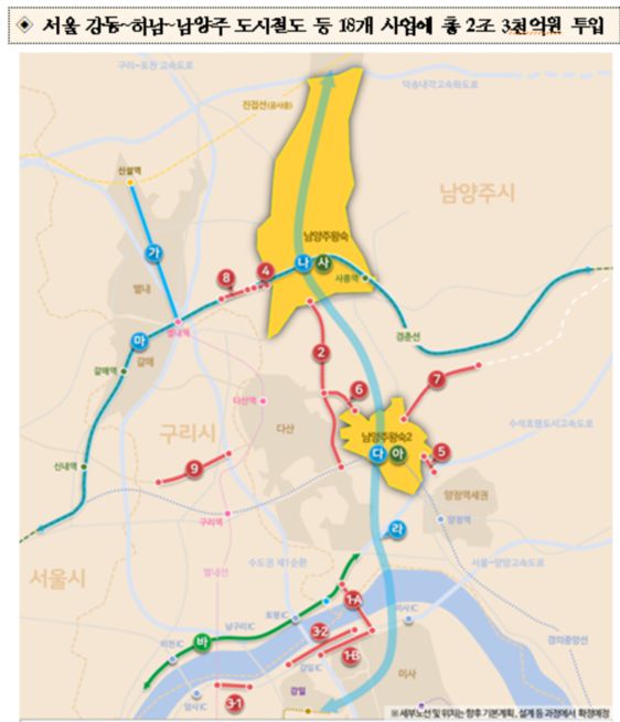 6만6000호가 들어설 예정인 왕숙신도시에는 18개 사업에 2조3000억원이 투입된다. 우선 강동 강일역에서 끝나는 9호선을 하남~남양주까지 잇는 지하철 9호선 연장 사업이 반영됐다. 총 사업비는 약 1조5032억원이 투입될 전망이다.