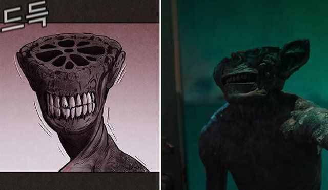 원작 네이버웹툰 ‘스위트홈’(왼쪽 사진)과 드라마에서 표현된 장님 괴물이 높은 일치율을 보인다. 극에서 큰 비중을 차지하는 이 괴물에게는 ‘연근이’라는 별명이 붙었다. 네이버웹툰 제공·넷플릭스 캡처