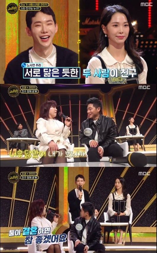이날 조권의 친구로 전민지가 등장했다. 그는 '썸'을 부르며 고운 음색을 자랑했다. 전민지를 본 노사연은 “얼굴 형, 분위기가 (조권과) 너무 비슷하다”면서 “둘이 결혼하면 좋겠다. 잘 살 것 같아”라고 말해 조권을 당황하게 했다.