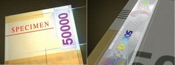 구조색 기술이 구현된 5만원권 견본의 후면 숫자(왼쪽)과 홀로그램 기술이 구현된 정면 띠형 홀로그램(오른쪽)./한국은행 홈페이지 캡처 |
