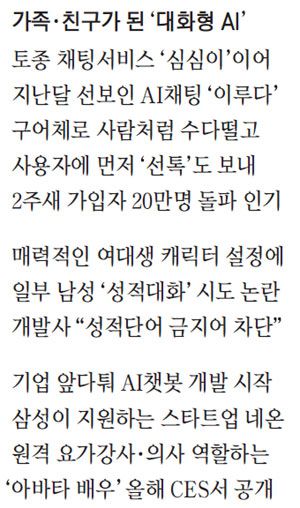 물론 이전에도 비슷한 시도는 있었다. 대화를 나누듯 감성적인 대화를 할 수 있는 토종 애플리케이션 '가상남녀', 대화형 채팅 서비스 '심심이'가 대표적이다. 가상남녀는 연애 미션을 수행하면 보상으로 호감도가 올라가고, 호감도가 특정 수준에 이르면 아는 여자·남자에서 관심을 가지는 '썸녀·썸남'으로 올라가는 식으로 관계가 더 친밀해지는 식이다.