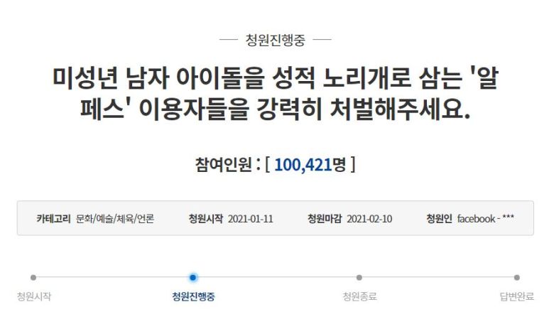 지난 11일 청와대 국민청원 게시판에는 “미성년 남자 아이돌을 성적 노리개로 삼는 ‘알페스’ 이용자들을 강력히 처벌해주세요”라는 글이 올라왔다. 청원이 제기된지 하루만인 12일 오후 참여인원은 10만명을 돌파했다.